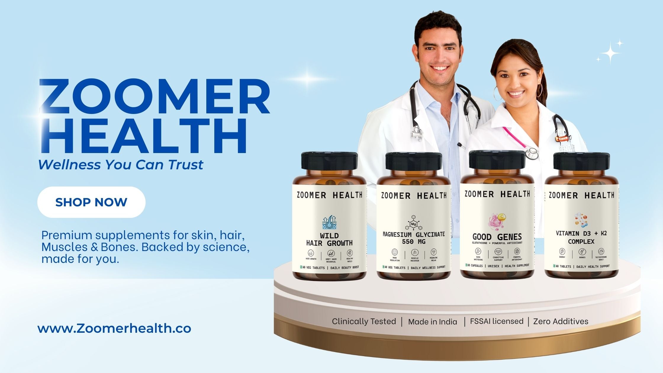 Shop nowAt Zoomer Health, we bring you the best supplements for hair growth, glowing skin, and overall wellness. Our range includes biotin for hair, glutathione tablets for skin whitening, vitamin D3 K2 for strong bones & immunity, and magnesium glycinate for better sleep & muscle recovery.Whether you need hair growth supplements, capsules for skin health, or daily nutrition, Zoomer Health is your one-stop solution. All our products are safe, vegan, and made in India to give you the best results naturally. Choose Zoomer Health – for hair growth, skin whitening, immunity, and complete wellness.
